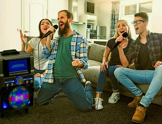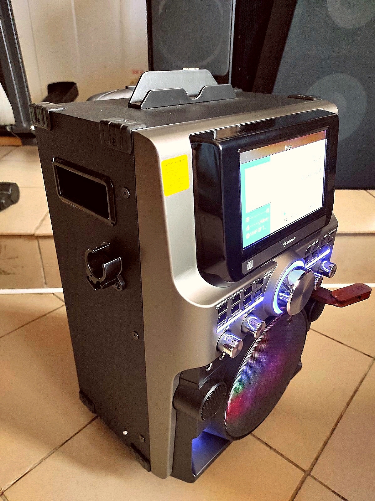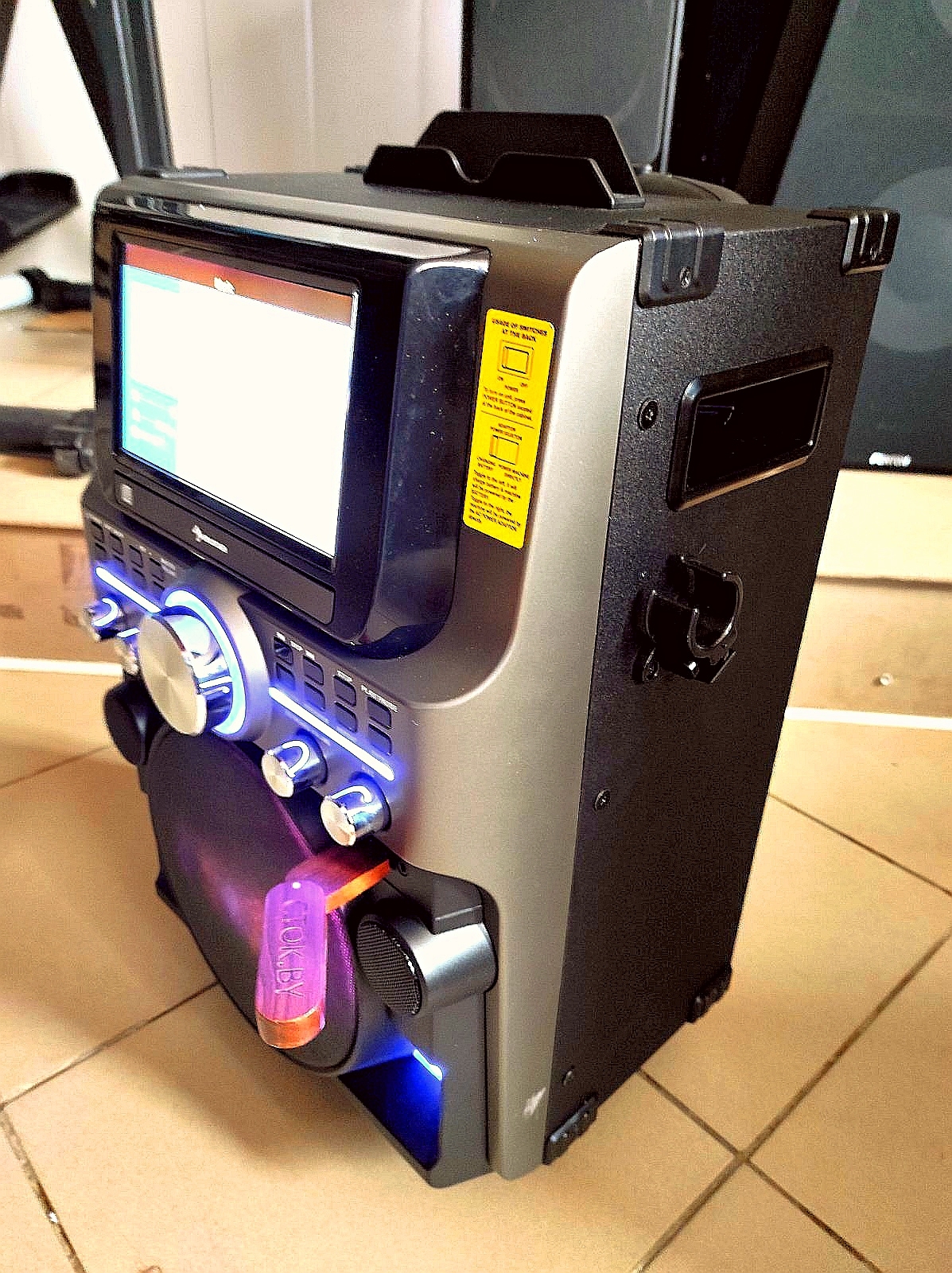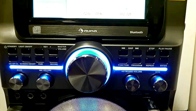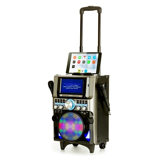 А так же встроенному блютуз соединению, подставки для планшета или смартфона, цветному дисплею и функции диско (дискотечное освещение)