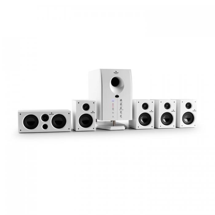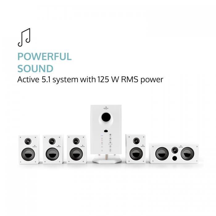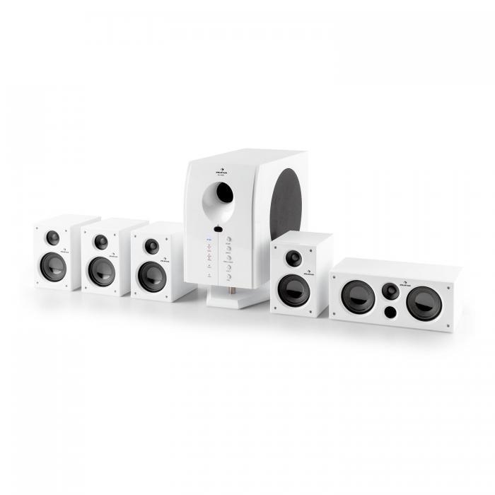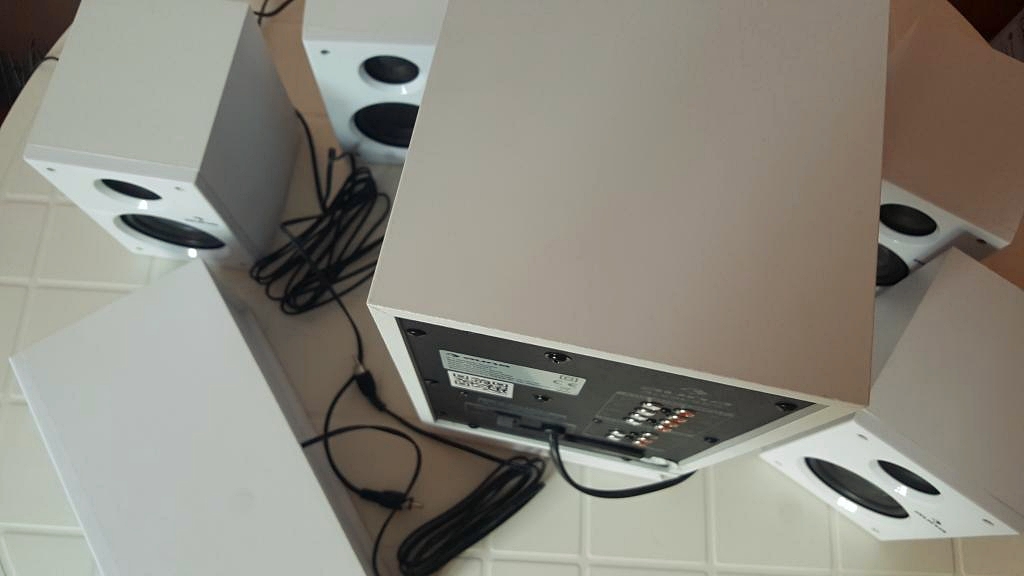 Активная система с сабвуфером 5,25 дюймов (13,5 см), пять сателлитных динамиков 3 дюйма (7,6 см) и общая мощность 50 Вт + 5х15 Вт RMS