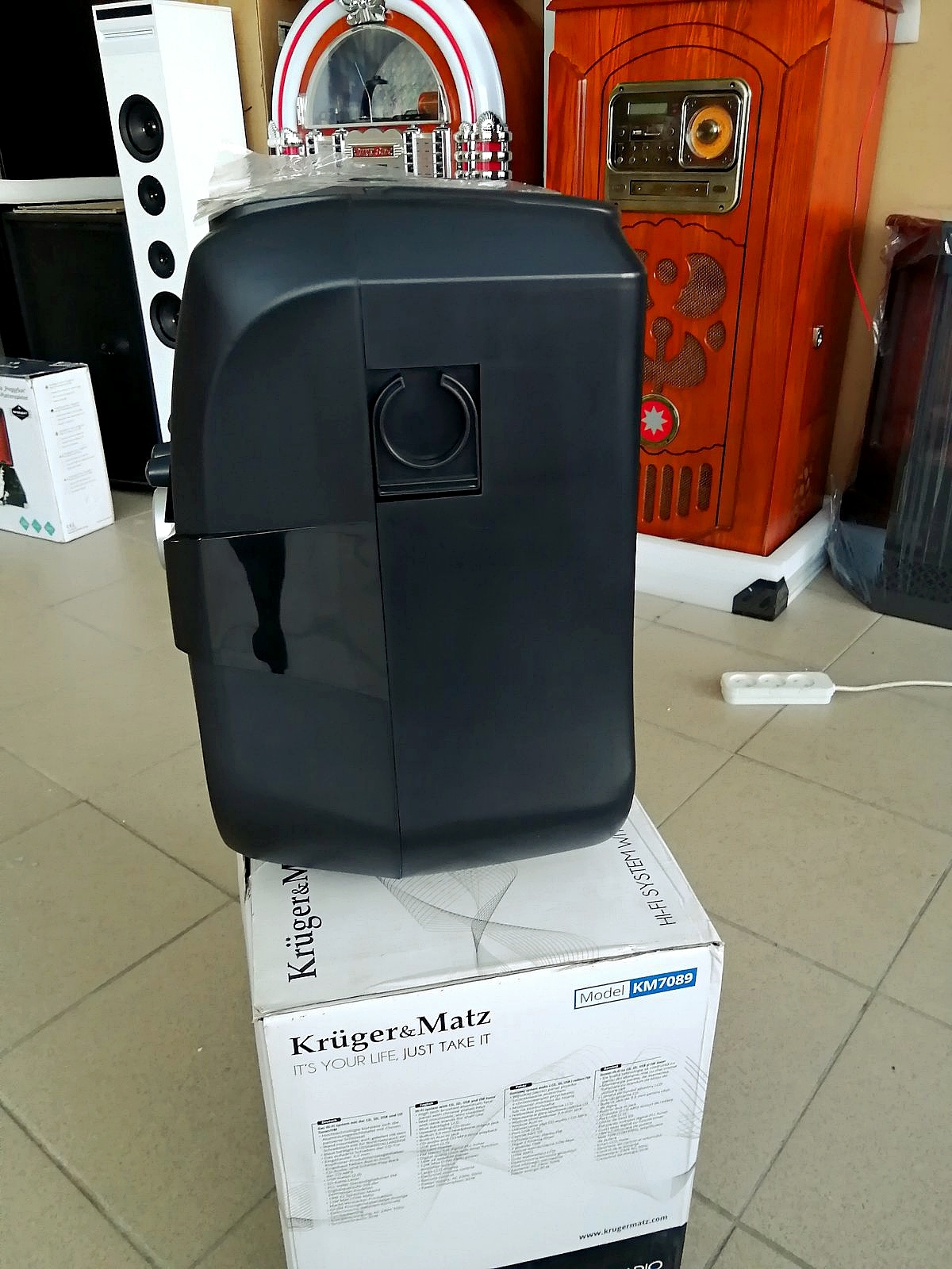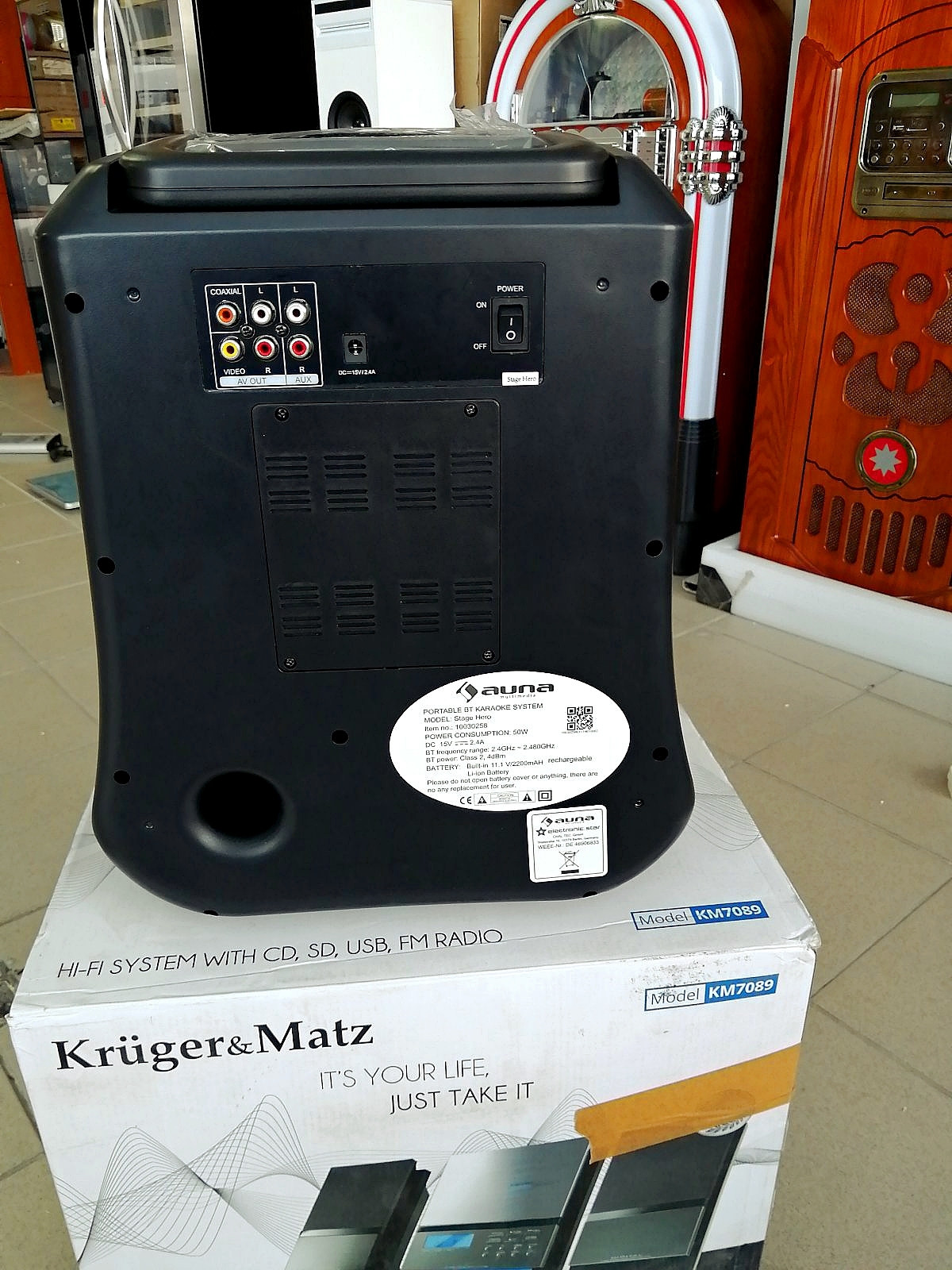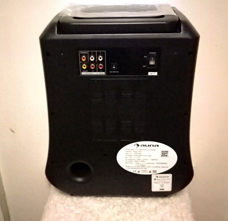 Соединения: 2x микрофонный вход 6,5 мм; 3,5 мм разъем Вход AUX (L + R); 3,5-мм разъем AV-выхода (L + R), 3,5-мм разъем видеовыхода; Коаксиальный выход гнезда 3,5 мм.