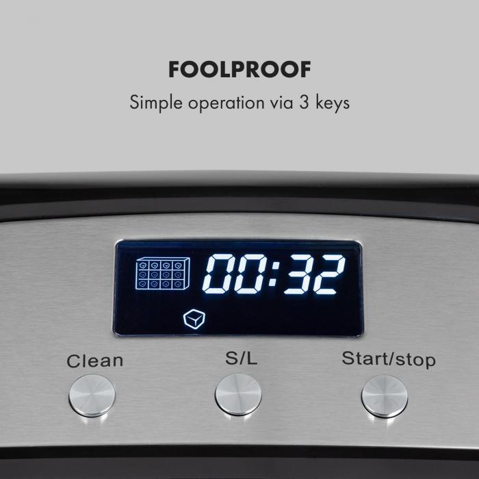 Кристально чистые кубики льда теперь находятся на расстоянии одного нажатия кнопки: с помощью устройства для приготовления льда Klarstein Crystal XL вы можете быстро приготовить прохладительные напитки! Независимо от того, коктейль это, или напиток от утоления жажды, напитки идеальны только при правильном охлаждении. С помощью машины для производства льда Klarstein Kristall XL напитки всегда получают правильный кубик льда. В случае с этой машиной это элегантные кубики из почти прозрачного хрустального льда. Небольшой охлаждающий блок готовит до 20 кг кубиков льда в течение 24 часов и, таким образом, обеспечивает круглосуточное освежение. Просто заполните 2,5-литровый резервуар водой, выберите желаемый размер кубика льда и все готово: в одно мгновение расходные материалы падают в 600-граммовый контейнер для кубиков льда, где они ожидают использования. Контейнер с кубическим прозрачным льдом может быть удален для легкого распределения. Управление также очень простое, с помощью всего нескольких кнопок. Отличная производительность не обязательно означает то же большое устройство! Машина для производства прозрачного льда Klarstein Kristall XL очень узкая и очень маленькая, поэтому она подходит для самого маленького прилавка и занимает действительно не так много места. Машина для производства льда — Klarstein Kristall XL - это маленький источник охлажденных льдом освежающих напитков.