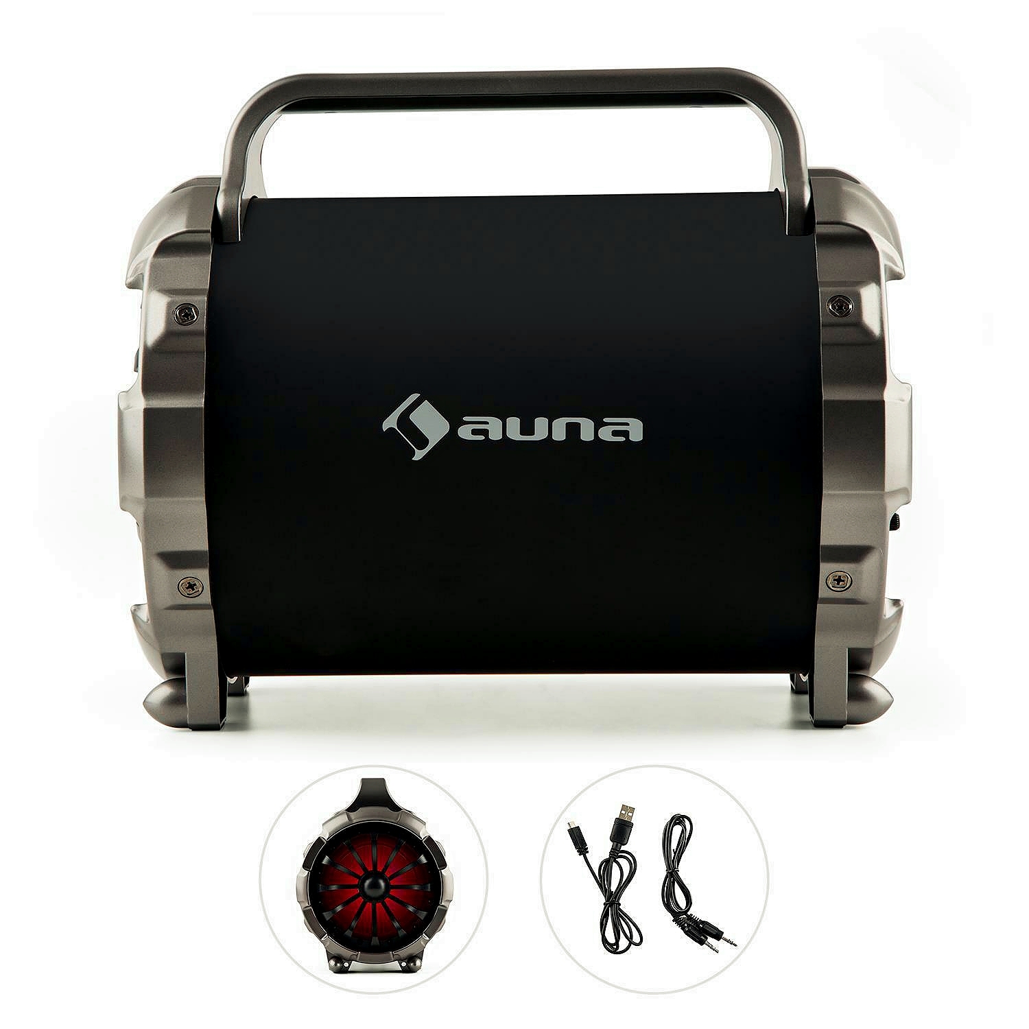 Auna Blaster M - Bluetooth колонка с необычным дизайном которая заставляет удивительные ритмы музыки светиться синим и красным, потому что широкополосные динамики 2 x 6,5 " имеют управляемую музыкой светодиодную подсветку. На пляже, в парке или на спонтанной вечеринке - портативная колонка Auna Blaster M очень мобильная и идеально подходит для использования вне помещений. Корпус эргономичный и чрезвычайно удобен в использовании благодаря ручке для переноски. Auna Blaster M воспроизводит песни со смартфонов, ноутбуков и других устройств с поддержкой Bluetooth, а также воспроизводит музыку с карт Micro SD или внешних аудиоисточников, оснащенных разъемами AUX. Радио FM с автоматическим поиском станции. Автономная, благодаря встроенной аккумуляторной батарее 3600 mAh, которая обеспечивает до 5 часов прослушивания музыки.