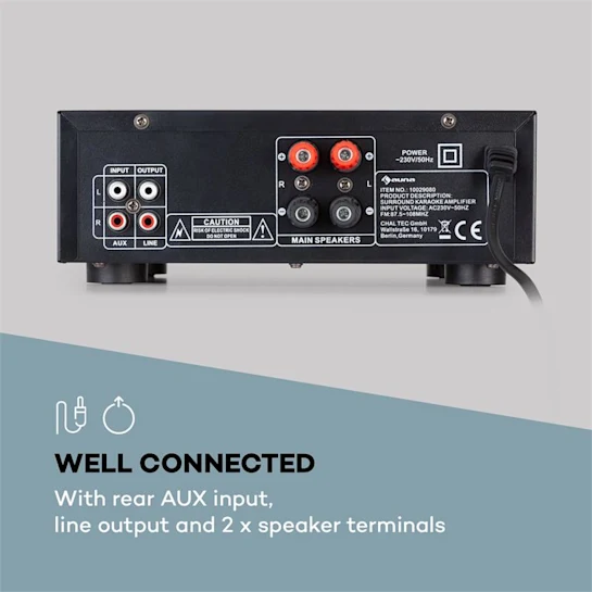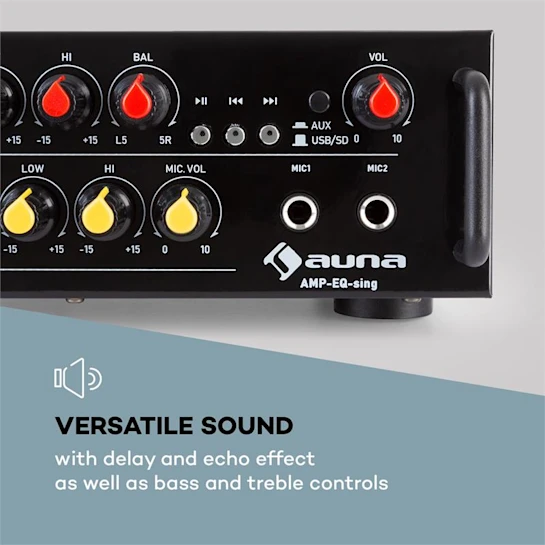 Надежная поддержка вашего голоса: караоке-усилитель auna Amp EQ BT HiFi впечатляет своей высокой производительностью, множеством вариантов подключения и многочисленными функциями. Auna Amp EQ BT с регулировкой низких и высоких частот - это сверхкомпактный караоке-усилитель с гибким диапазоном использования. Вход AUX на задней панели и линейный выход соединяют усилитель auna с таким оборудованием, как DVD-плееры, CD-плееры, компьютеры и MP3-плееры. Кроме того, усилитель предлагает подключение двух радио или проводных микрофонов, что расширяет диапазон использования для таких мероприятий, как караоке-вечеринки, встречи или презентации. Секция микрофона регулируется отдельно и оснащена регулируемой задержкой и эффектом эха для достижения оптимального звукового результата. Благодаря небольшим размерам караоке-усилитель auna Amp EQ BT HiFi можно установить где угодно. Его прочное металлическое шасси делает его удобным для транспортировки.