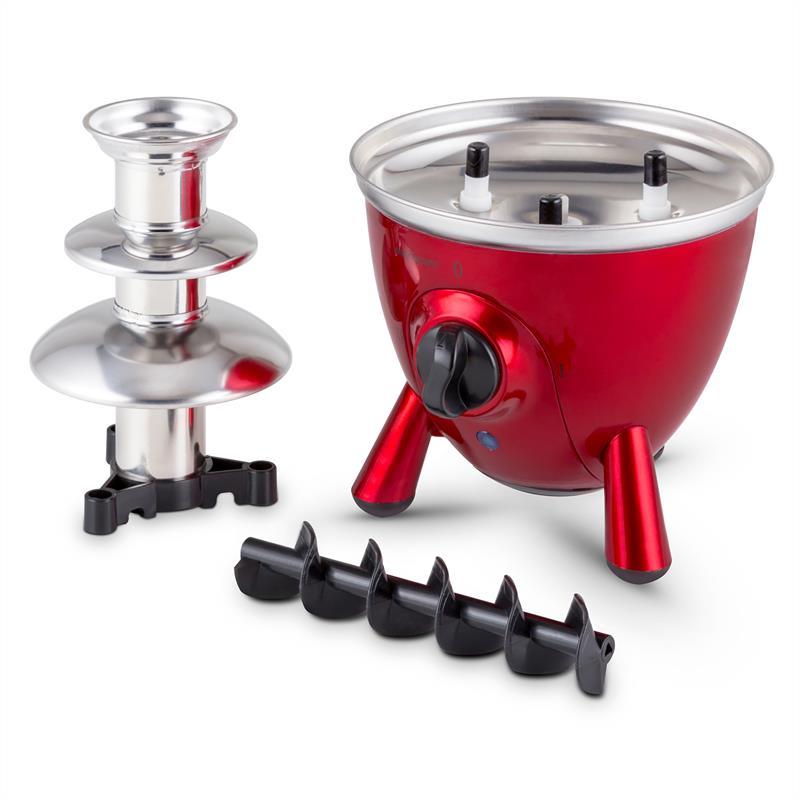 Мини фабрика по производству оригинального угощения для детей на днях рождения, семейных праздниках или просто, чтобы полакомиться. Корпус и башня из нержавеющей стали, 60W нагревательный элемент, расплавляет в жидкое состояние шоколад, сыр или соус для барбекю, для дальнейшего нанесения в качестве верхнего слоя на конечный продукт. 17см в высоту, 3-ступенчатый каскад в виде башни и два режима работы для идеального качества шоколада. Принцип шоколадного фонтана гарантирует веселье, детские глаза при этом загораются и праздник запоминается намного дольше. Принцип работы достаточно прост, в миску кладут дольки шоколада, миска подогревается в первом режиме, и как только масса расплавится и не останется мелких кусочков можно включать второй режим – конвейерная подача расплавленного шоколада в верхнюю часть башни, откуда она фонтаном будет стекать вниз и так по кругу. Интервалы в каскадах башни 6см, 5,5 см и 5см обеспечивают достаточно места, чтобы нанизанные кусочки фруктов, таких как ананас, банан, яблоко или груша, целые ягоды, печенье или зефир полились слоем шоколада. Гурманы могут добавлять в шоколад ликер или бренди, а также молоко, сливки или растительное масло для разнообразия качества смеси. И не следует думать, что данное устройство подходит только для сладостей, так это может быть сырный фонтан или фонтан с соусом.